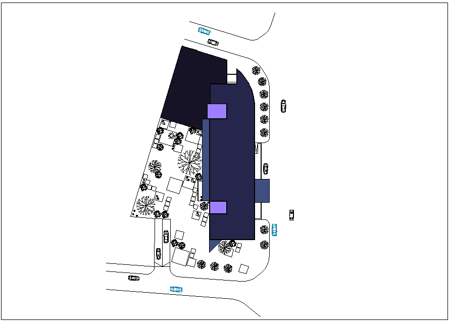 Landscape view of hotel dwg file in landscape view of hotel with road and tree area view,parking and garden view and view of dining area view with necessary view and detail.