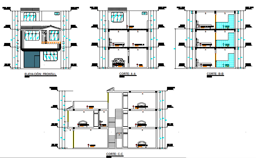 Detail of elevation and section dwg file, front elevation detail, section A-A’ detail, section B-B’ detail, section C-C’ detail, leveling detail, dimension detail, naming detail, etc.