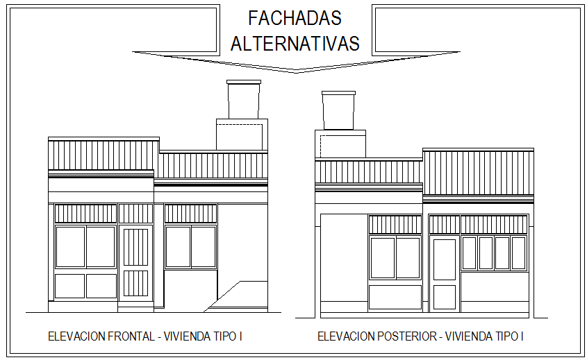 Elevation one family house autocad file, front elevation detail, side elevation detail, chimney detail, furniture detail in door and window detail, parapet wall detail, etc.