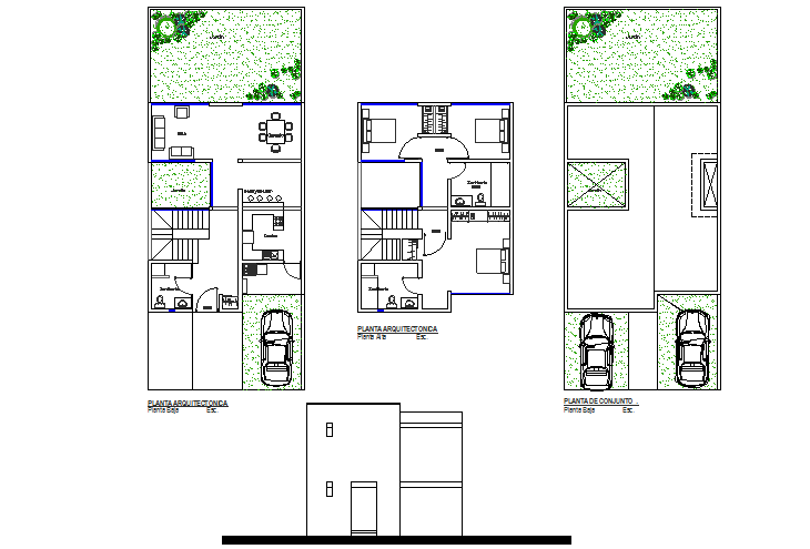 Housing plan and elevation detail layout file, landscaping detail in tree and plant detail, front elevation detail, architect design in the living room, bed room, kitchen detail, car parking detail, furniture detail in table, chair, door and window detail, etc.