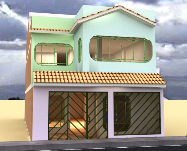 Single-family home Front view 3 D plan detail, ground floor to first-floor detail, wall reeling detail, roof detail, glass window detail, etc.