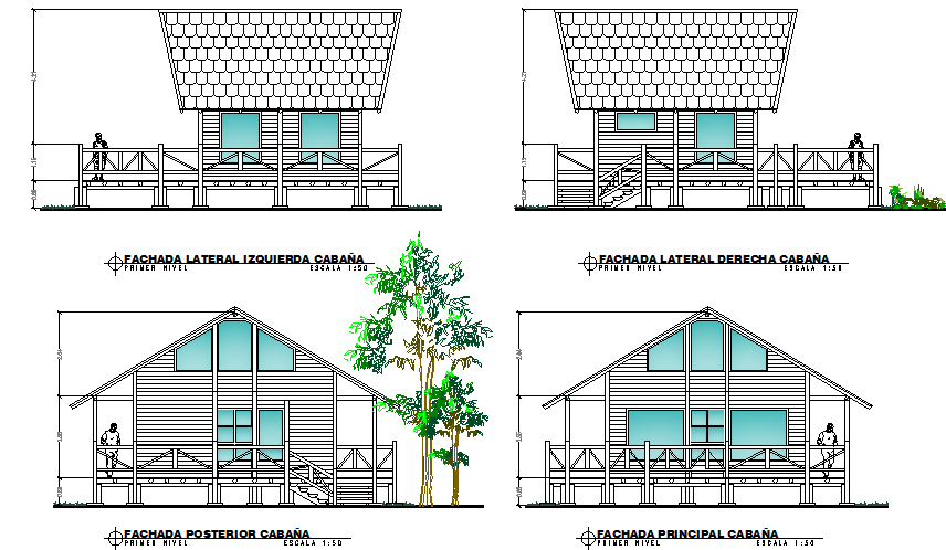 Elevation mountain cabin autocad file, front elevation detail, right elevation detail, left elevation detail, back elevation detail, scale 1:50 detail, landscaping detail in tree and plant detail, dimension detail, naming detail, etc.