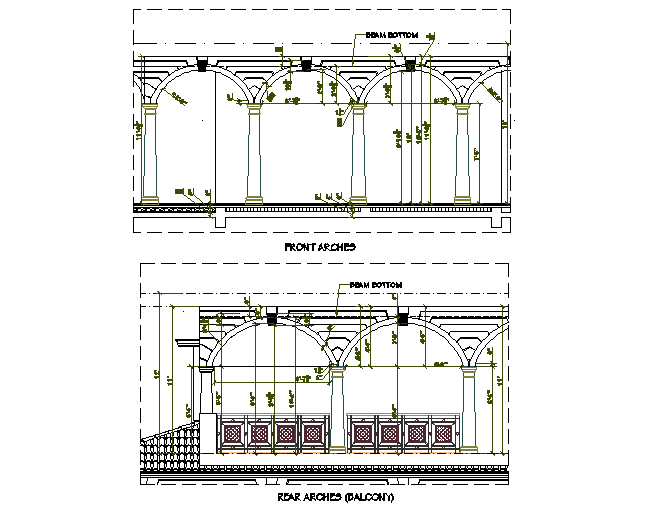 Architect arches elevation plan detail dwg file, dimension detail, rear arches detail, front arches detail, naming detail, wall gate reeling detail, etc.