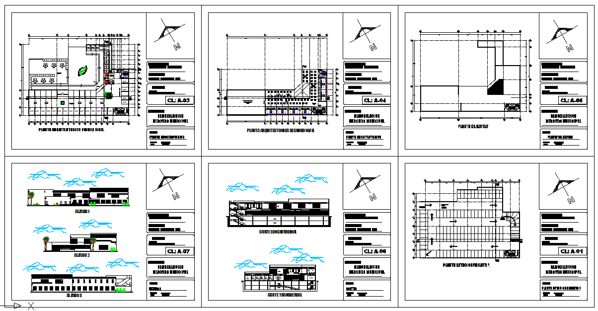 commercial remodeling plaza Design, architectural level first level, second level architectural floor, roof plant, parking plant 1, longitudinal cut etc.