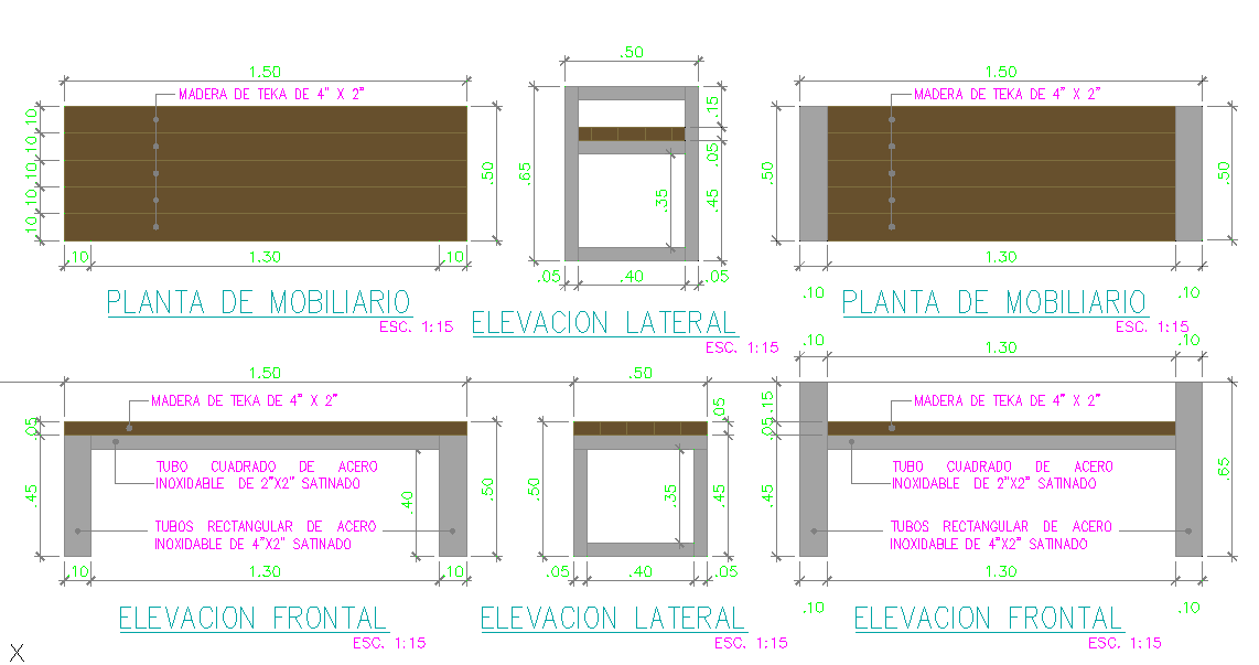Park benches walk or terraces Design. furniture plant, front elevation, Square stainless steel 2 "x2" satin tube, Rectangular stainless steel 4 "x2" satin tubes.
