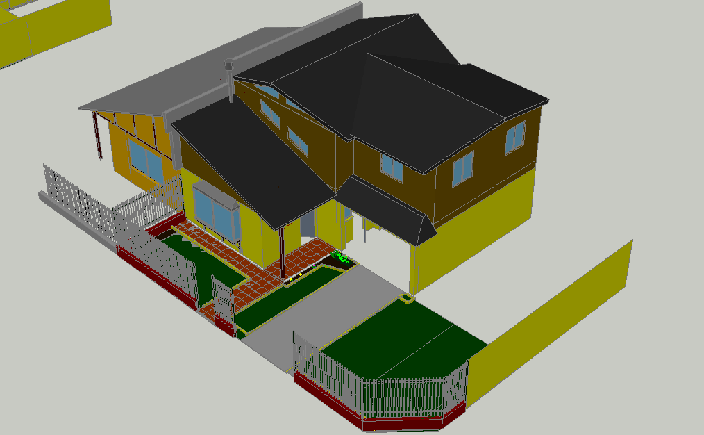 3D view of housing with architectural view dwg file in 3d view of house with view of grill door in entry way,floor view with designer door and window view,wall and wall support view truss area view with