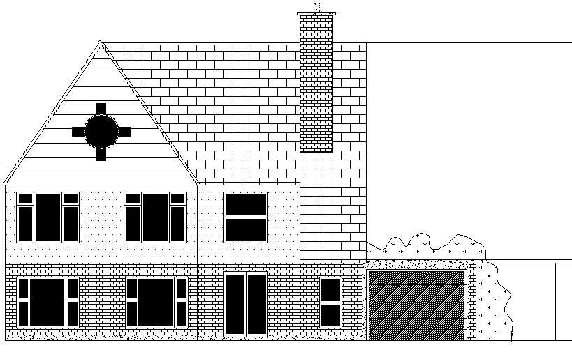 Elevation house autocad file, chimney detail, furniture detail in door and window detail, brick wall detail, front elevation view detail, etc.