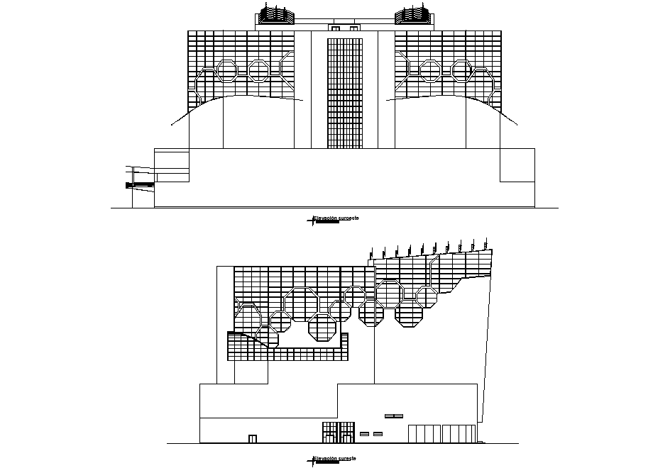 Detail of elevation commercial tower plan dwg file, front elevation detail, side elevaton detail, perapit detail, etc.