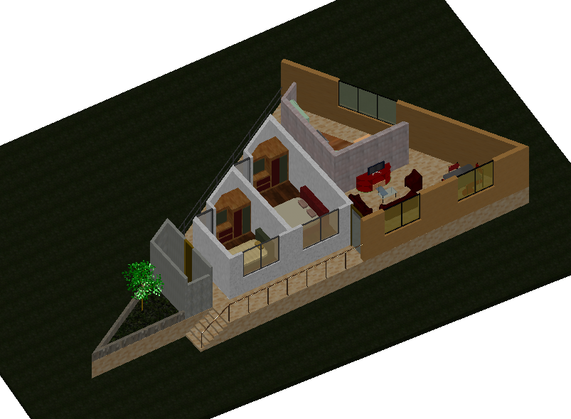 3 D house plan dwg file, landscaping plant and tree detail, furniture detail in sofa, table, chair, cub board, door and window detail, stair detail, etc.