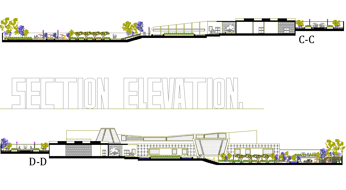 Section elevation mall layout file, section C-C’ detail, section D-D’ detail, landsceping detail in tree and plant detail, street light detail, bench detail, etc.