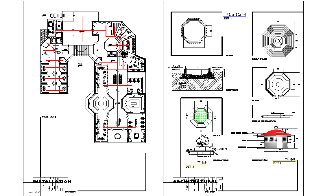 Installation and architectural plan dwg file, dimension detail, naming detail, plumbing pipe line detail, landsceping detail in tree and plant detail, furniture detail in table, chair, door and window detail, scale 1:500 detail, etc.