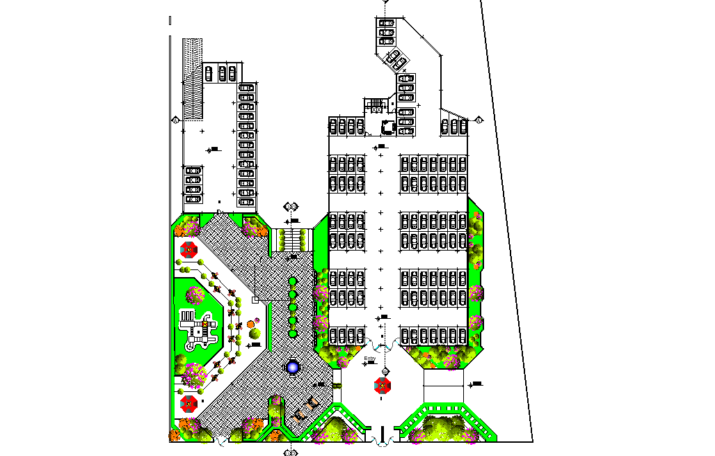 Plot layout basement plan autocad file, section line detail, car parking detail, landsceping detail in palnt and tree detail, leveling detail, stair detail, ramp detail, etc.