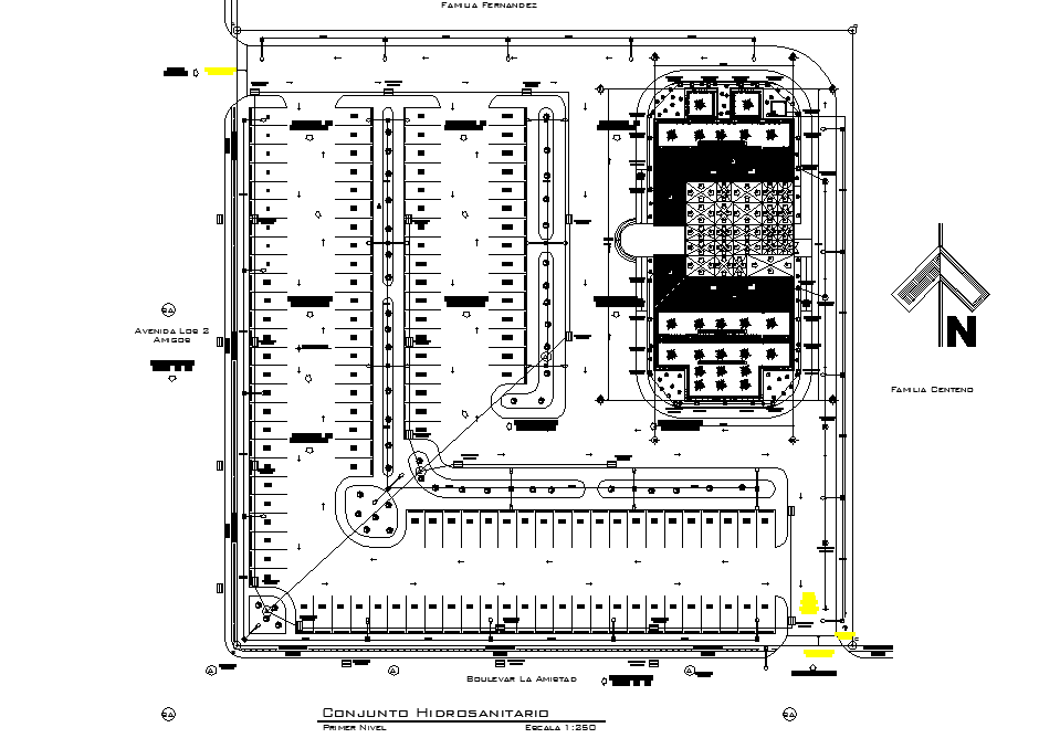 North direction plot detail autocad file, section line detail, dimension detail, naming detail, bolck divivded detail, landsceping detail in tree and plant detail, scale 1:250 detail, etc.