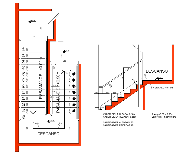 Staircase plan and section detail dwg file, dimension detail, naming detail, tread and riser detail, handrail detail, etc.