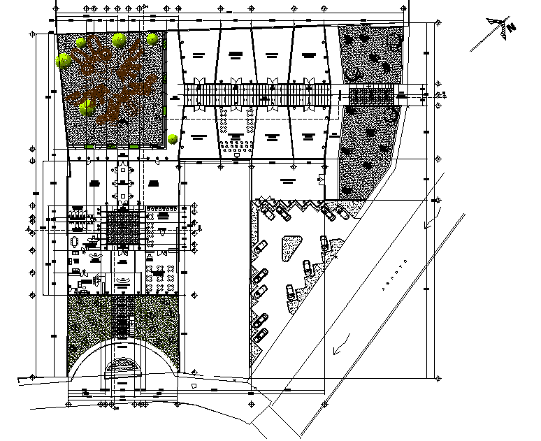 Market plan detail autocad file, north direction detail, centre lien plan detail, landscaping detail in tree and plant detail, car parking detail, dimension detail, naming detail, etc.