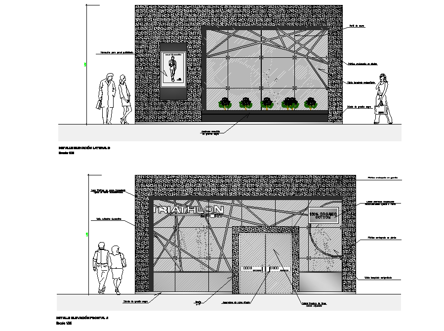 Elevation commercial shop autocad file, front elevation detail, side elevation detail, dimension detail, naming detail, glass elevation detail, landscaping detail in tree and plant detail, etc.