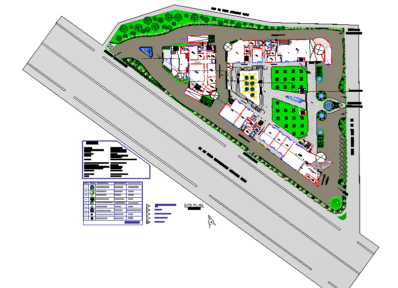 Site plan north direction autocad file, legend detail, road detail, landscaping detail in tree and plant detail, section line detail, car parking detail, ramp detail, etc.