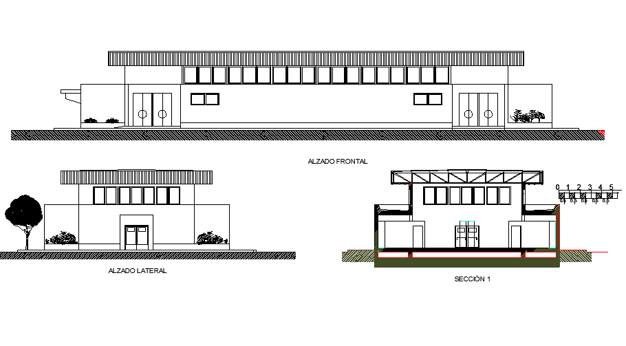 Project market elevation and section layout file, front elevation detail, side elevation detail, section 1-1 detail, landscaping detail in tree and plant detail, furniture detail in door and window detail, etc.