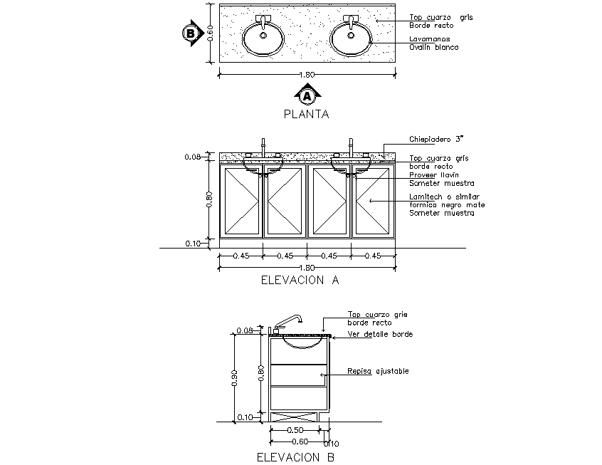 Double sink plan and elevation autocad file, dimension detail, naming detail, elevation A-A’ detail, elevation B-B’ detail, etc.