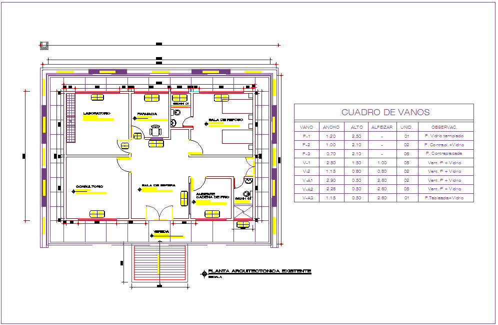 Health center plan with door and window schedule dwg file in plan with view of wall and area distribution view,entry area,consultant room,pharmacy area,laboratory,washing area and door and window schedule with necessary dimension.