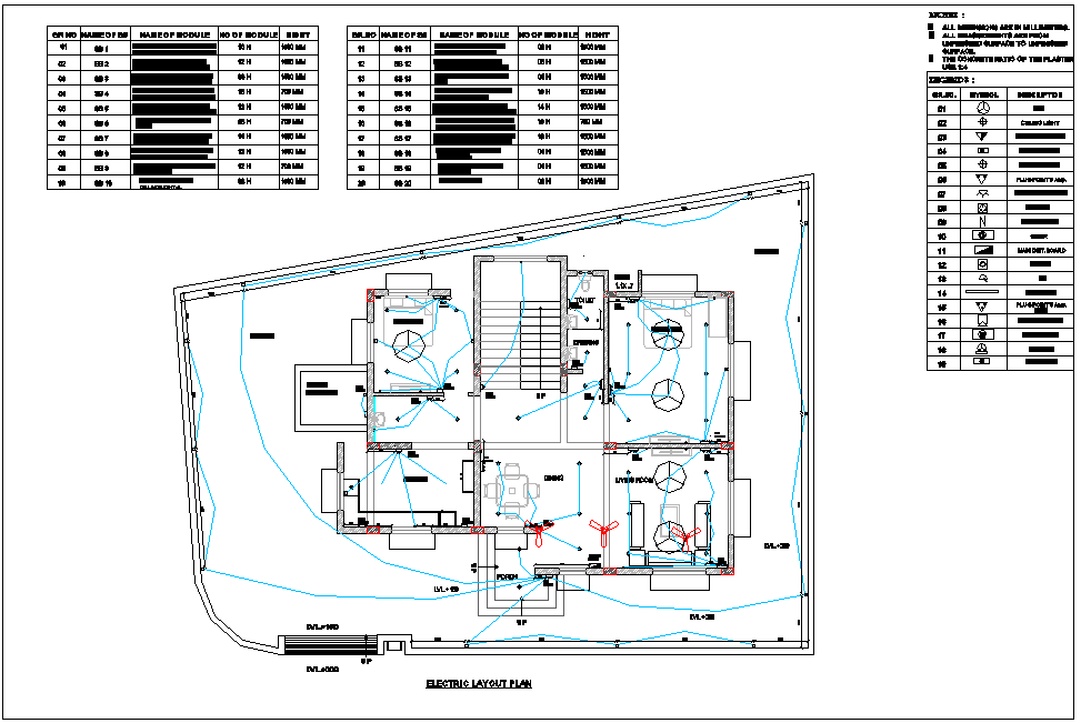 Electrical installation plan of bungalows dwg file in plan with view of area view of bungalows with wall view and electrical single line view with its connection and joint with its legend view and view of distribution board of electrical system with necessary detail.