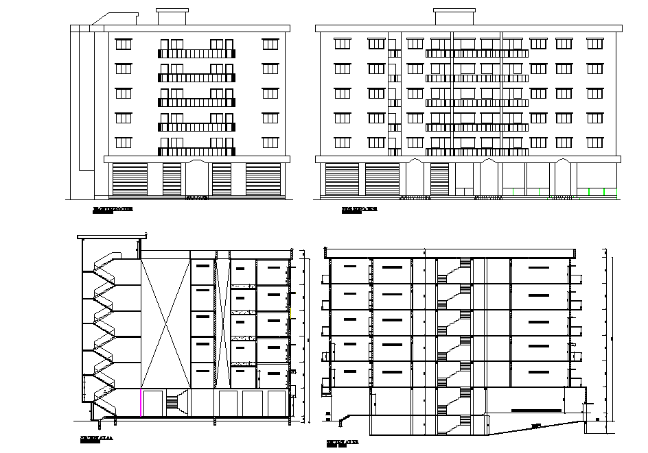 Section and elevation Commercial complex vegetable market plan, diemnsion detail, leveling detail, naming detail, cut out detail, etc.