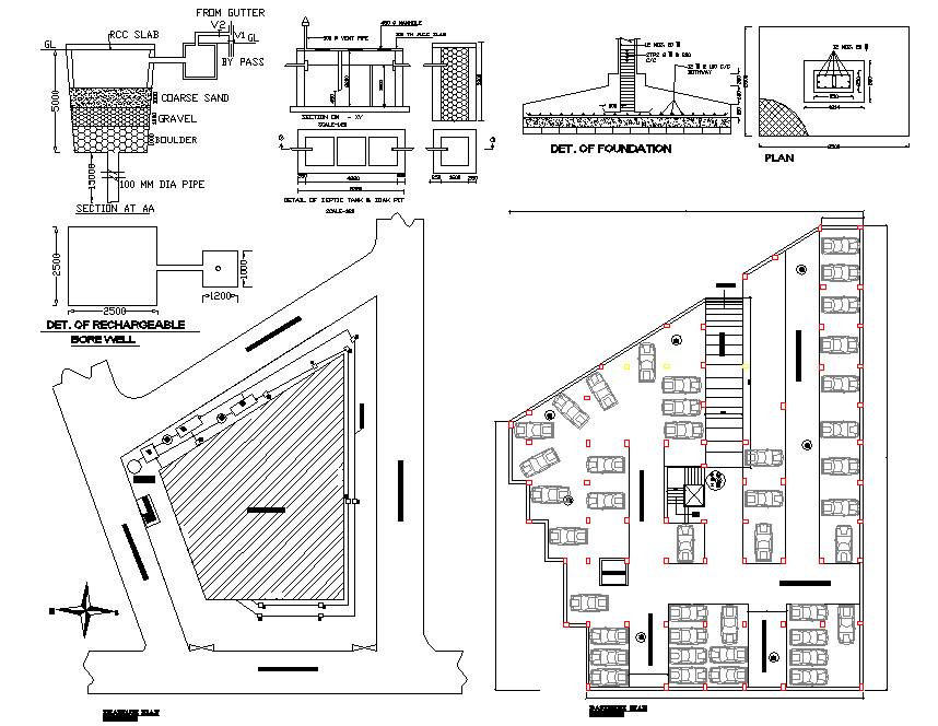 Foundation section plan dwg file, dimension detail, naming detail, basement detail, car paking detail, reinfrocemnt detail, north direction detail, etc.