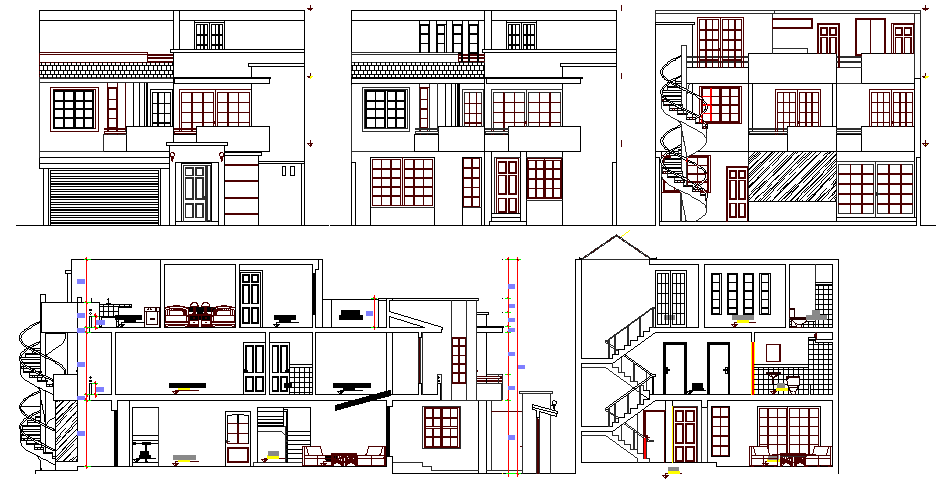 Three flooring one family bungalow elevation and sectional view details dwg file