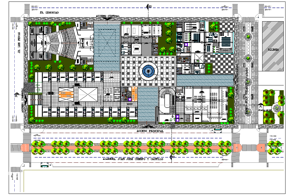 Landscaping plot civic center plan autocad file, section line detail, landsceping detail in tree and plant detail, furniture detail in table, chair, door and window detail, stair detail, road detail, etc.