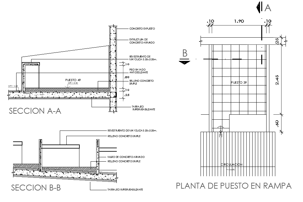 Ramp station plant detail dwg file, plan and section detail, section A-A’ detail, section B-B’ detail, diemnsion detail, namign detail, section line detail, reinfrocement detail, etc.