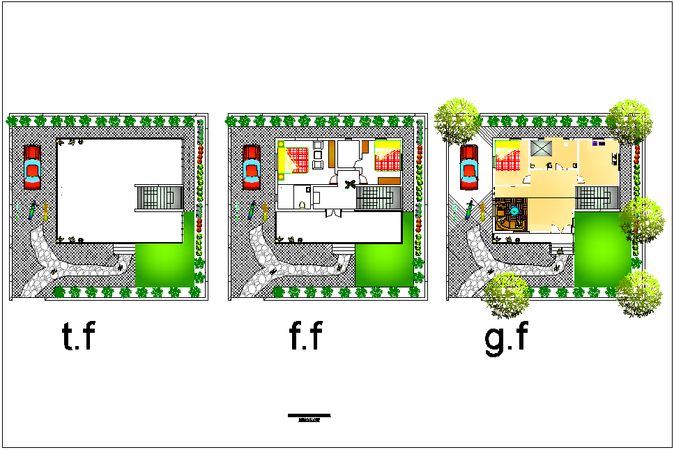 Floor plan of landscape view of bungalows dwg file in first floor plan with view of tree and road view with parking area,bedroom,kitchen,washing area and view of first and terrace floor plan with view of