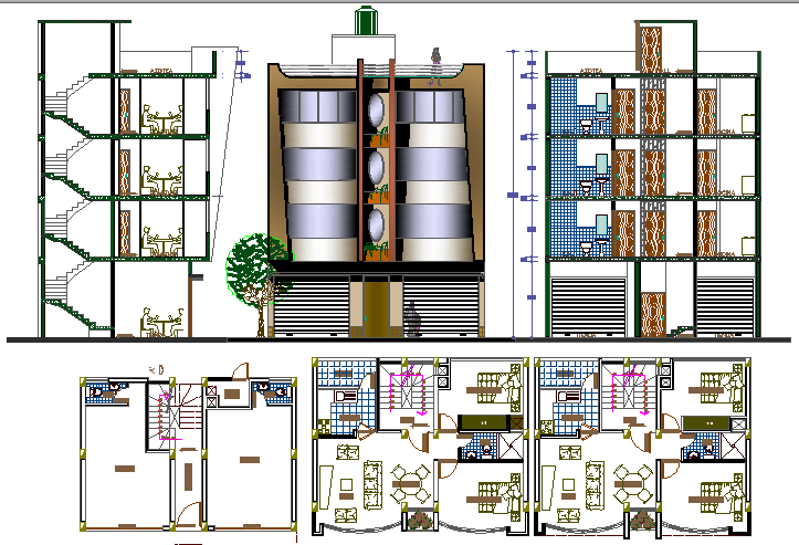 Multi-family housing apartments elevation, sectional and layout plan details dwg file