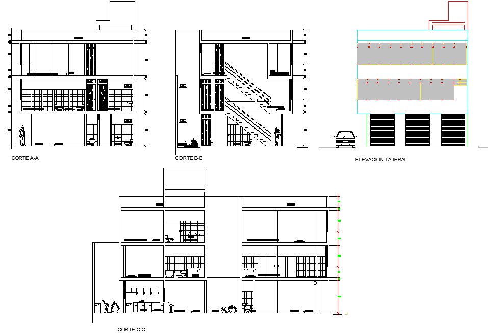 Elevation and section single family home layout file, front elevatio detail, section A-A’ detail, section B-B’ detail, section C-C’ detail, landsceping detail in tree and plant detail, dimension detail, namign detail, stair detail, etc.
