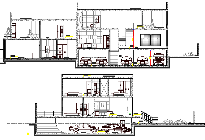 Front and back sectional view of two flooring villa dwg file.