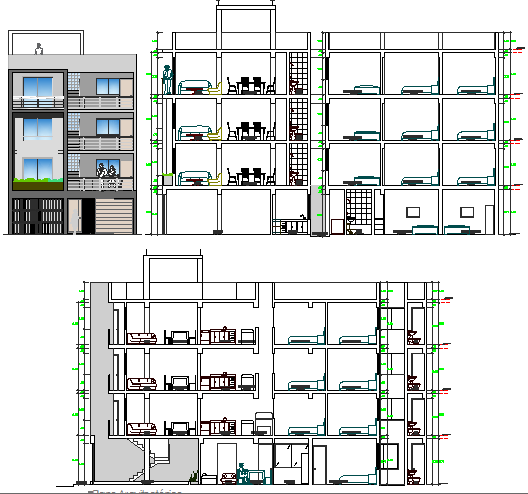 Multi-family residential housing apartment elevation and section details that includes a detailed view of side elevation, doors and windows view, staircase view, balcony view, tree view, toilets, living room, bedroom and much more of apartment details.