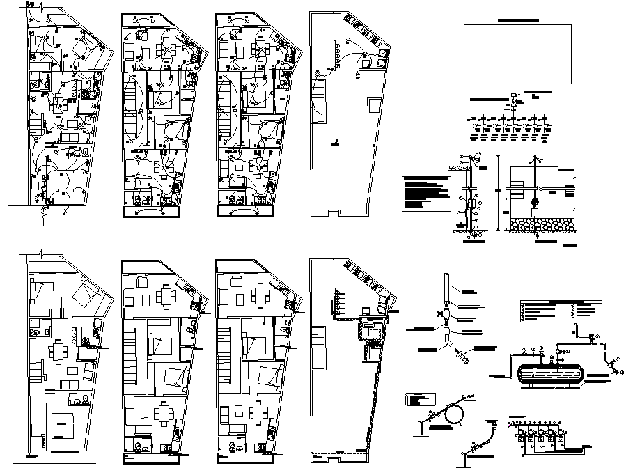 Electrical house plan autocad file, ground floor to terrace floor plan detail, furniture detail in table, chair, door and window detail, toilet detail, stair detail, etc.
