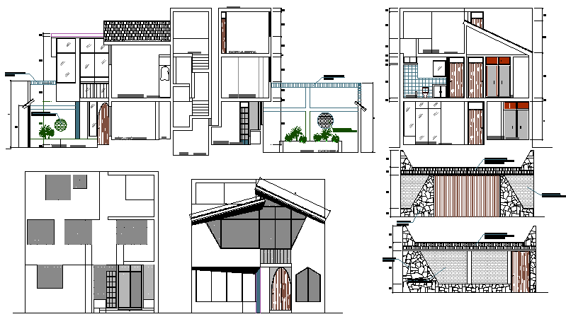 Multi-level single family house elevation and section plan that includes a detailed view of front elevation, back elevation, doors and windows view, tree view, staircase view, balcony view, terrace view and much more of house project.