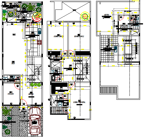 Three flooring residential bungalow floor layout plan details that includes a detailed view of ground floor, first floor, top floor, car parking, mini garden, main entry door, family hall, living area, bedroom, master bedroom, kitchen, dining area, toilets and bathroom, terrace and much more of building floor plan details.