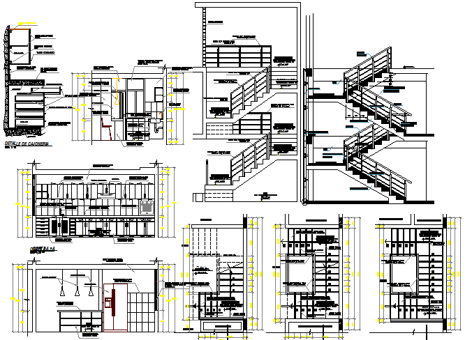 All sided sectional details of three level housing bungalow dwg file