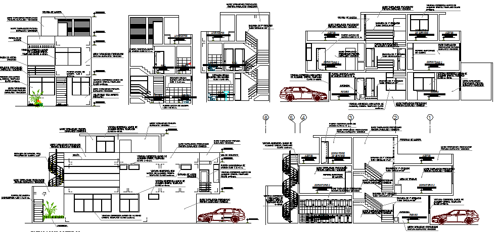 Three flooring bungalow elevation and sectional view details that includes a detailed view of front elevation, car parking view, tree view, front section, back section, staircase sectional view, doors and windows view, balcony view, terrace view, measures and much more of bungalow details.