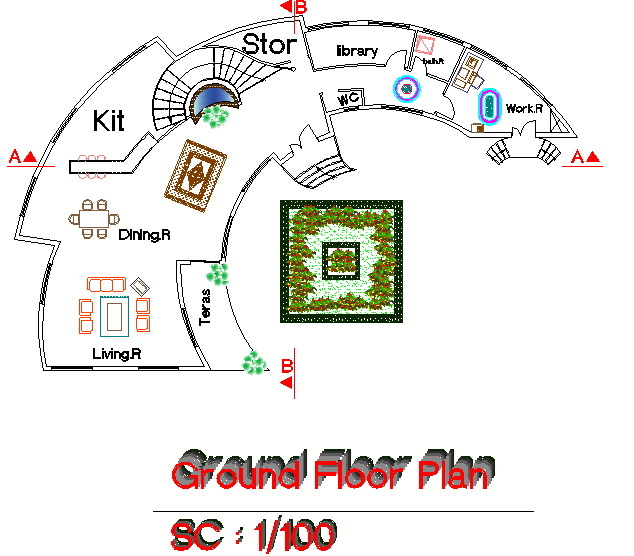 Ground floor plan, this file contains, dining area, kitchen, store room, staircase view etc