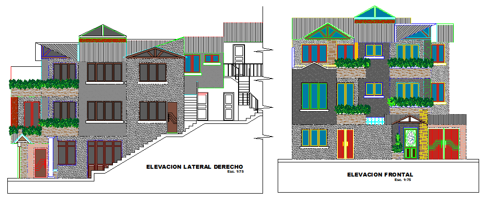 Multi-family dwelling house front and back elevation details that includes a detailed view of flooring view, balcony view, doors and windows view, roof or terrace view, staircase view and much more of house elevation.
