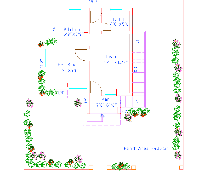 1bhk house plan with measurement details, stairs detail, landscaping etc.
