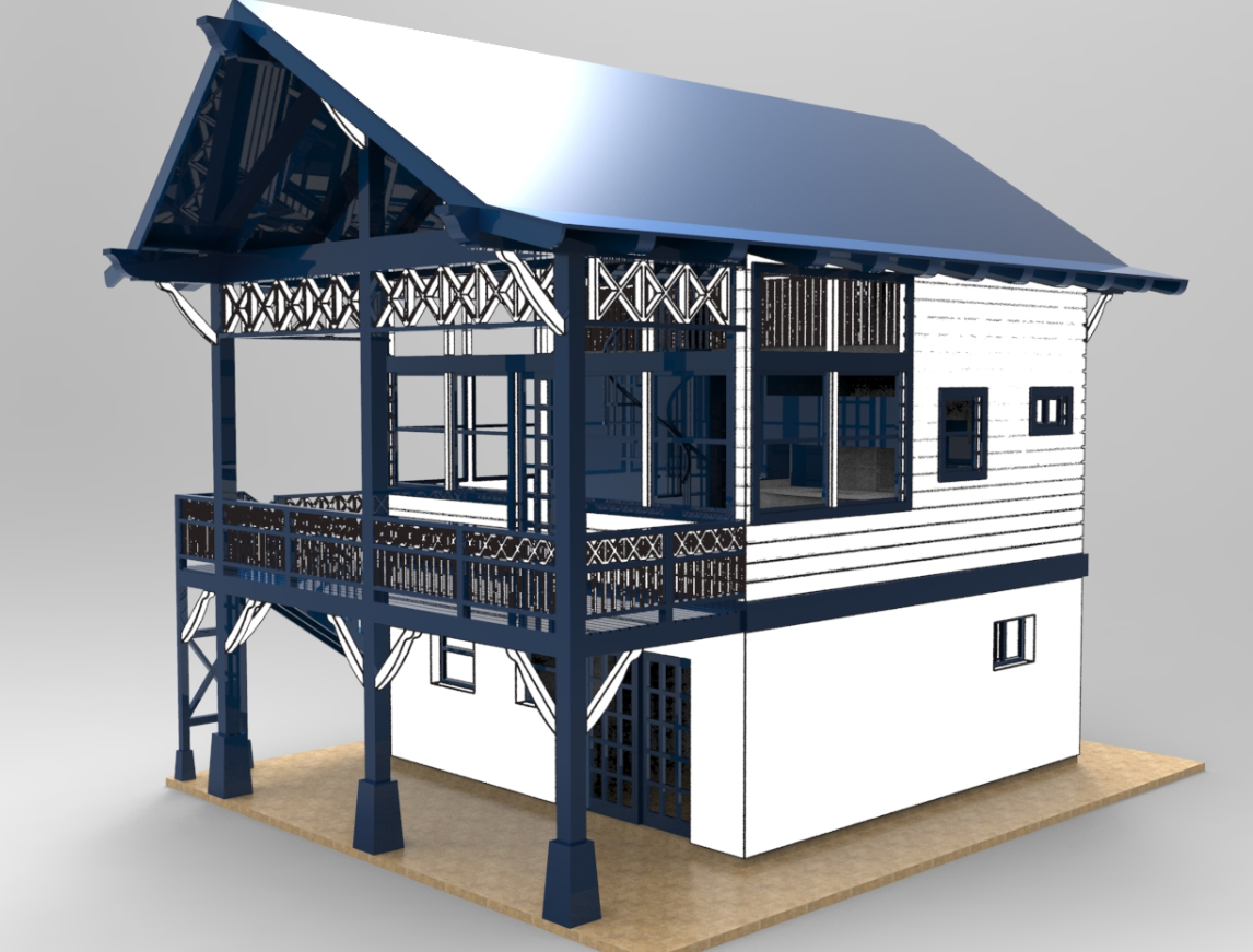 3d max dwg file of 2 stories house of wooden structure with roof,balcony,coloumns,entry door ,windows