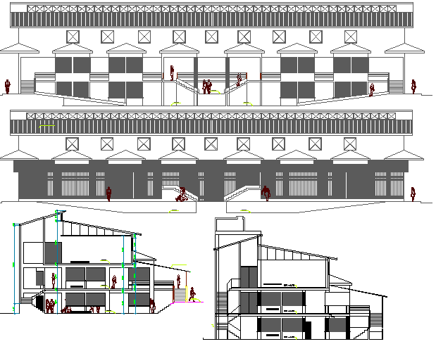 Multi-flooring shopping center elevation and sectional view dwg file.