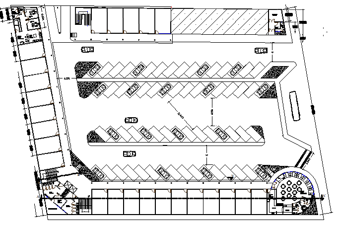Car parking layout of shopping center that includes a detailed view of indoor roads, outdoor roads, specified car parking space, entry and exit gate, sanitary facilities and much more of car parking layout.