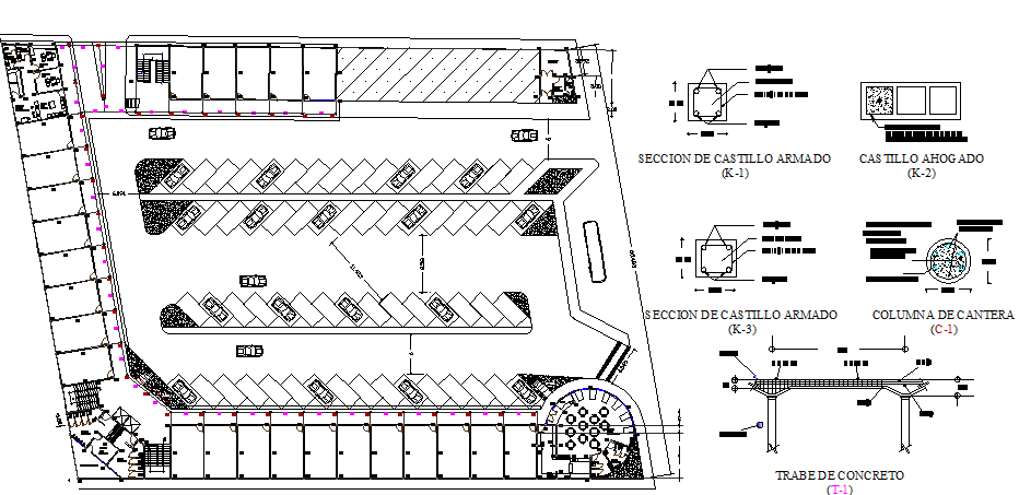 Multi-level shopping center basement floor plan with construction details that includes a detailed view of column view, beam view, indoor roads, outdoor roads, specified car space, constructive details, entry gate, guard cabin, cafeteria and much more of basement floor plan.