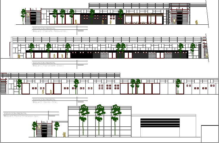 All sided elevation and sectional details of shopping center with stores dwg file.