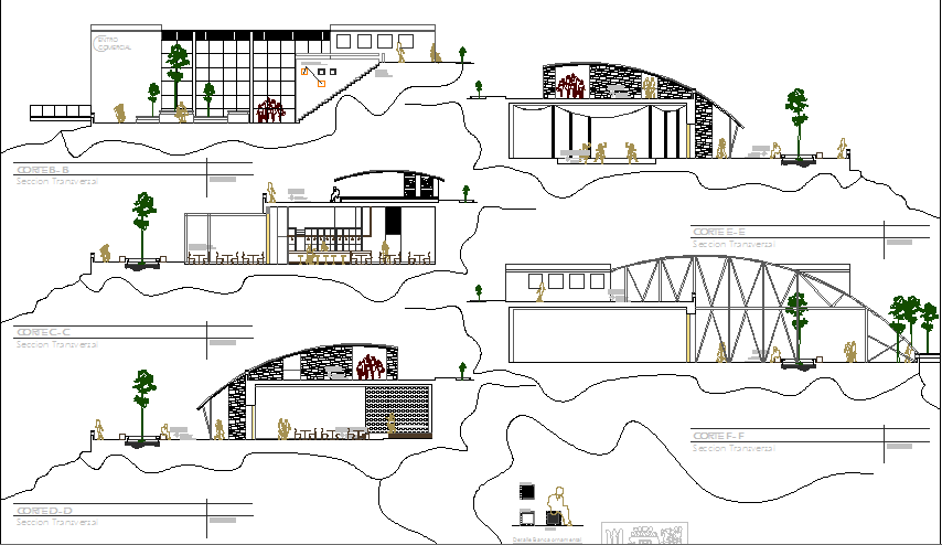 Side elevation and sectional view of mountain view shopping center dwg file.
