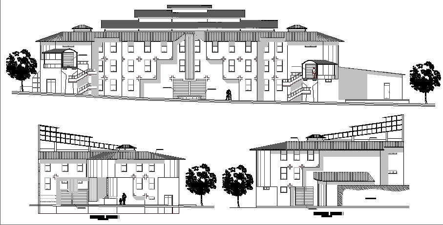 Front and side elevation view of industrial plant that includes a detailed view of tree view, dome view, roof view, wall design, balcony view, staircase view, flooring view, doors and windows view, roof or terrace view and much more of plant details.
